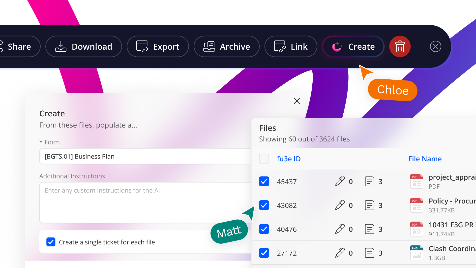 Multi-Create can handle up to 40 files in a single action. This allows teams to process more work with fewer steps. fu3e.ai guides you through each stage with helpful automation tools that support clarity and speed.